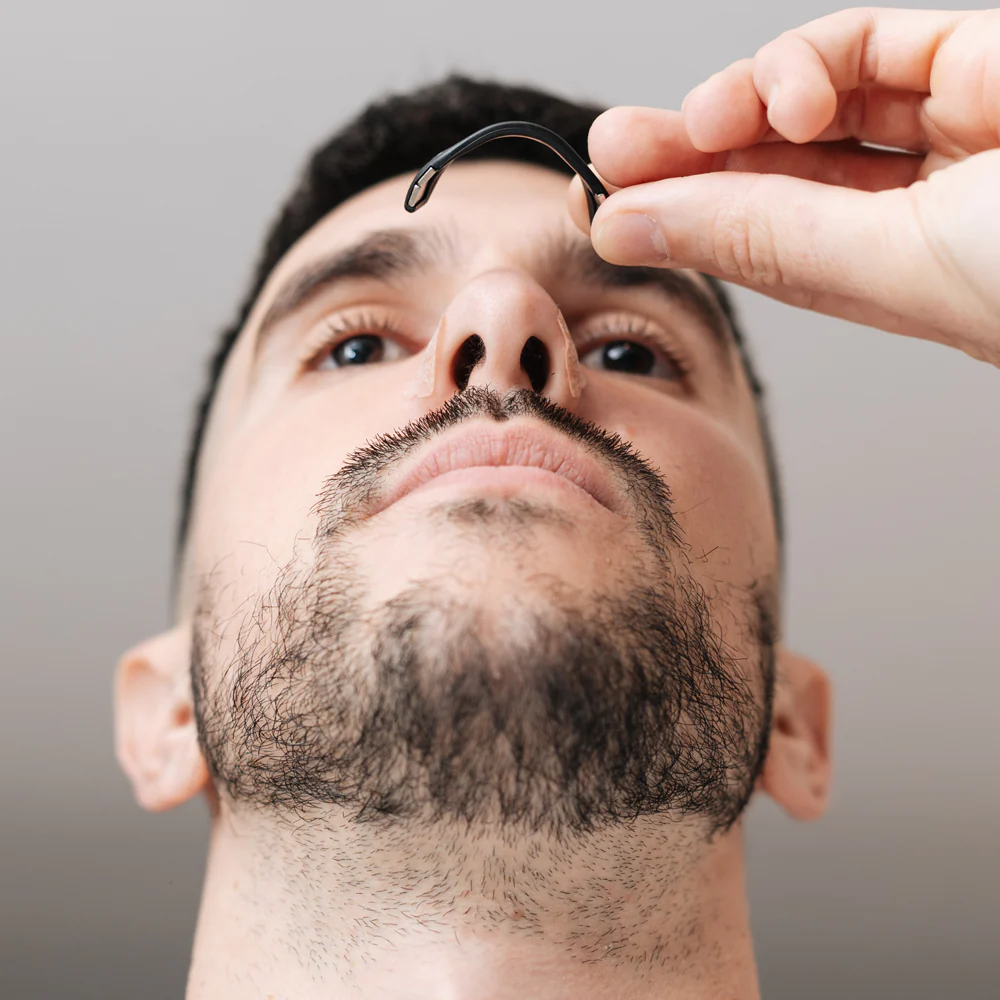 Primero, debemos colocarnos los Stickers Magnéticos en el exterior de la nariz. Luego colocaremos la banda magnética (elegimos el tamaño deseado) y automáticamente se abrirán las fosas debido a los imanes.