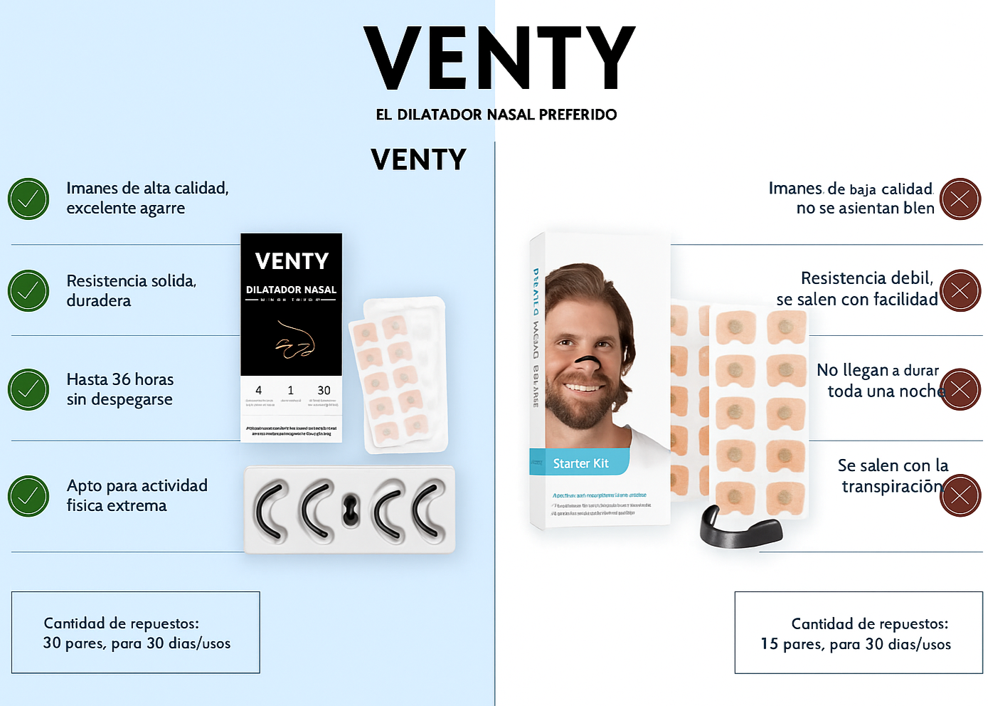 VENTY está diseñado para abrir las fosas nasales y permitir mas flujo de aire.