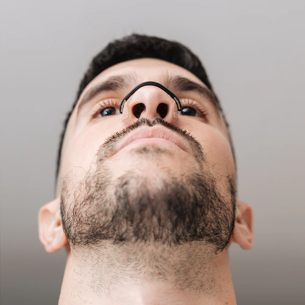 La respiración nasal reduce los ronquidos y los síntomas de la apnea del sueño al mantener abiertas las vías respiratorias y garantizar un flujo de aire constante, lo que mejora la calidad y la salud del sueño.